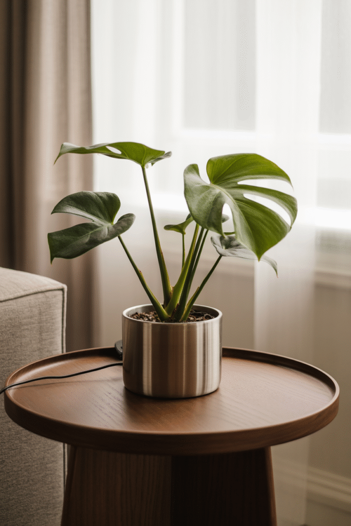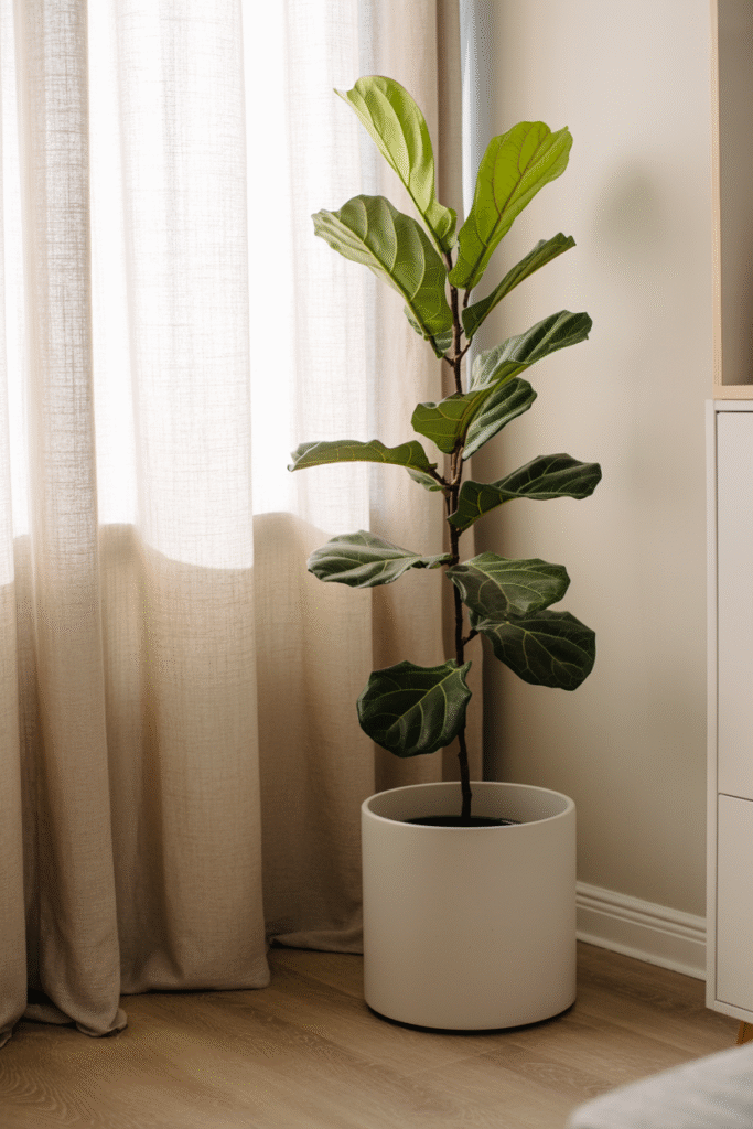 Start with one big, eye-catching plant. In my living room, I have a fiddle leaf fig (Ficus lyrata) in a 60 cm (24 inch) pot. It’s about 1.8 meters (6 feet) tall now, and it anchors the corner by the window. I’ve found that a single large plant creates a focal point without clutter. Other good options: rubber plant, bird of paradise, or a gently pruned money tree. Expect to spend around ($25–$50) for a healthy starter, and give it about 1–2 hours every couple of months for maintenance (dusting leaves, checking for pests).