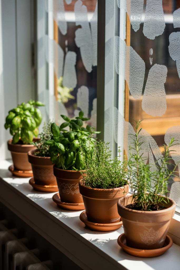 If you have a wide, sunny windowsill (at least 20 cm/8 inches deep), line it with a row of small potted herbs: basil, mint, thyme, and rosemary. Not only do they smell amazing, but you can snip fresh herbs for cooking. I keep mine in simple terracotta pots (/$1–$3 each). This setup takes about 30 minutes to plant and costs ($7–$15) for the plants and pots.