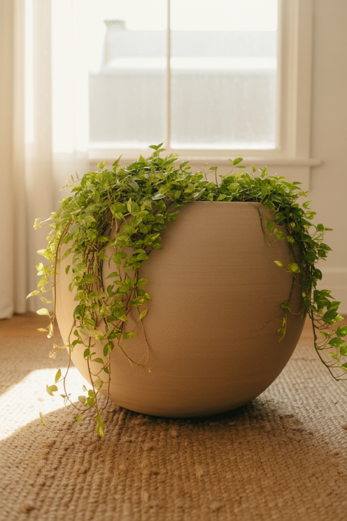 Choose one beautiful, oversized planter (ceramic, concrete, or woven) and fill it with a lush, multi-stemmed plant. I like golden pothos for this—it fills out quickly and trails over the edge. The planter is the star here, so splurge if you can.