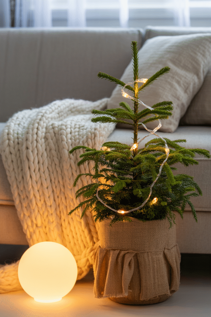 I love swapping plants in and out with the seasons. In summer, I might add a fiddle leaf fig or a big Monstera for a tropical look. For winter, I bring in a Norfolk pine (about 60 cm/2 feet tall, $15 at my local nursery) and decorate it with tiny LED lights. These seasonal changes keep the room feeling fresh, and it’s a tradition my friends look forward to.
