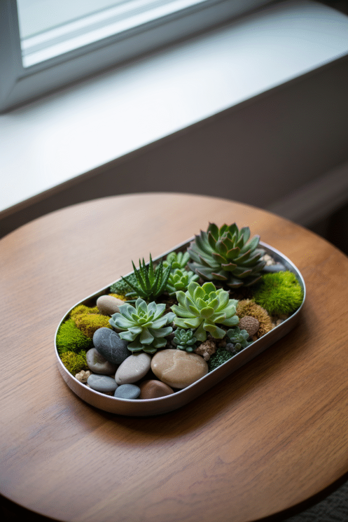 Place a shallow tray on your coffee table and fill it with small succulents, moss, and decorative stones. It’s a living centerpiece that’s easy to move when you need the space.