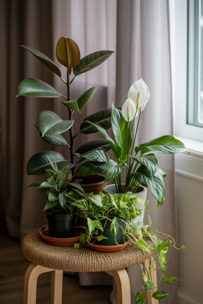 Group two or three medium plants together on a low stool or woven basket near a sunny window. Try a rubber plant, a peace lily, and a philodendron. The different leaf shapes and heights create visual interest. This is an easy weekend update.
