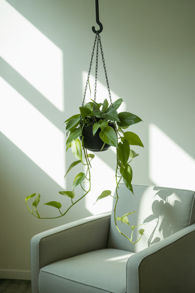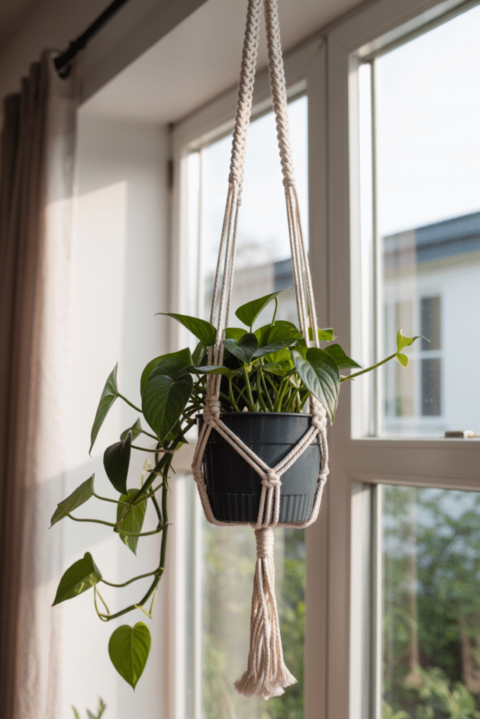 Trailing plants are some of my favorite additions for small spaces. Hang a macramé hanger near a window (about 30 cm/12 inches from the glass) and put in a healthy spider plant, string of pearls, or English ivy. Expect to pay ($4–$8) for a readymade hanger, or make your own for about half that. You can even train a pothos vine along a curtain rod or shelf edge, I’ve done this in rental homes where hanging wasn’t an option.