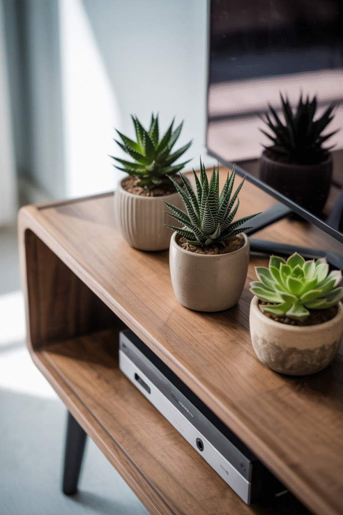 Add a row of small green plants along your TV console or media unit. I like Haworthia, gasteria, or small agave because they stay compact and sculptural. Three to five plants in a staggered line make a big difference. This setup takes 20 minutes to arrange and costs about ($12) for the plants (even less if you propagate some from cuttings).