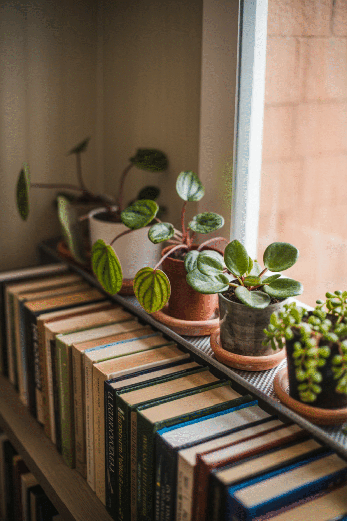 Tuck small plants between books and decor on your shelves. I use tiny cacti, peperomias, and string of pearls for this. They add life without clutter. Just be sure the shelf gets some light no dead zones.