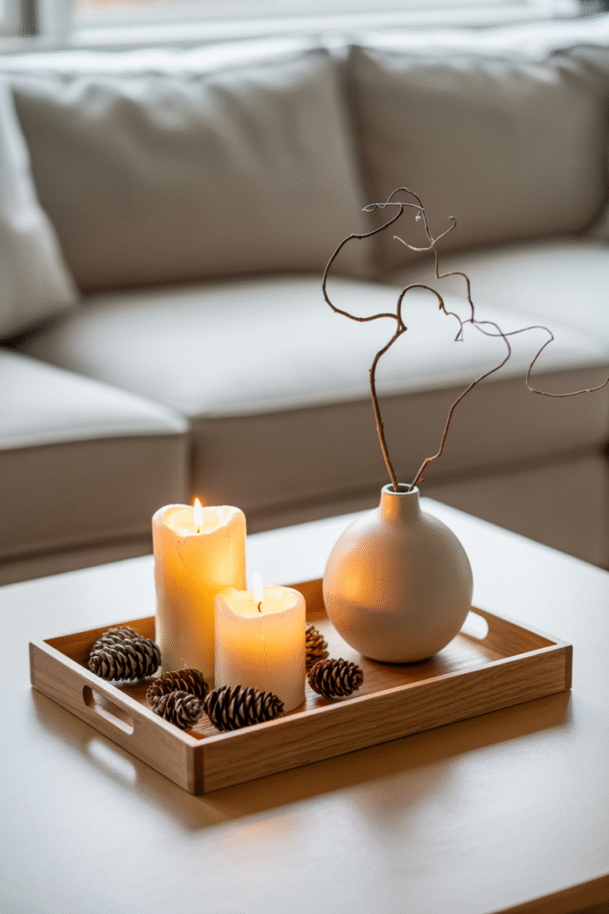 One of my favorite minimalist tricks is repurposing what you already own. A wooden tray can hold a few candles and pinecones for a holiday vignette. Glass canisters filled with red and green lentils or dried cranberries look festive on a kitchen counter. Last December, I turned a client’s collection of white ceramic vases into a “winter village” by adding a tea light inside each—simple, beautiful, and zero cost.
