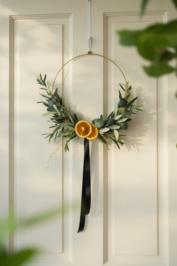 A wreath doesn’t have to be big and bushy. I love making simple, modern wreaths with a grapevine or metal ring, a few sprigs of eucalyptus or olive branch, and a single ribbon or dried citrus slice. Hang it on your door or above the mantel for instant holiday charm. One year, I made a wreath for a client using a 30 cm (12 in) metal ring, a handful of dried orange slices, and a thin black ribbon—people asked where she bought it!