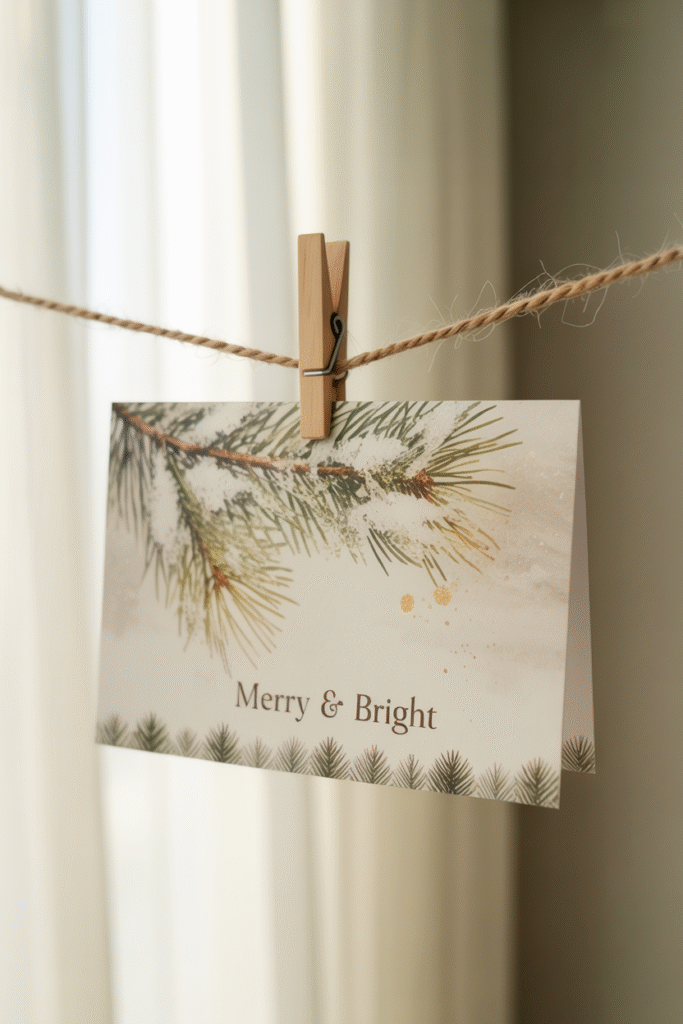 Instead of taping cards haphazardly to the wall or piling them on a table, create a simple card display. Try a length of twine with mini clothespins, a framed grid on the wall, or a shallow bowl or basket. Last year, I hung a 1.5 m (5 ft) length of jute twine along a hallway and clipped up each card as it arrived. It became a festive gallery without clutter.
