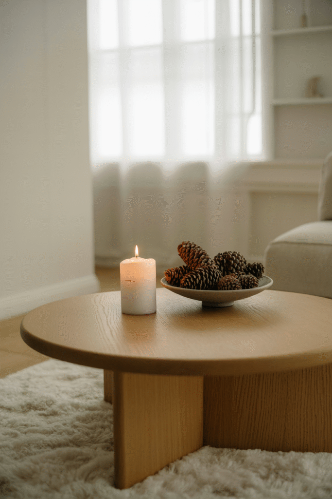 One of the easiest ways to add warmth without clutter is to bring in natural materials. Pinecones, dried citrus slices, bare branches, and even bundled cinnamon sticks look beautiful grouped in a bowl or scattered down the center of a table. I keep a stash of foraged pinecones and dried oranges from year to year—they cost nothing and make any room feel special.