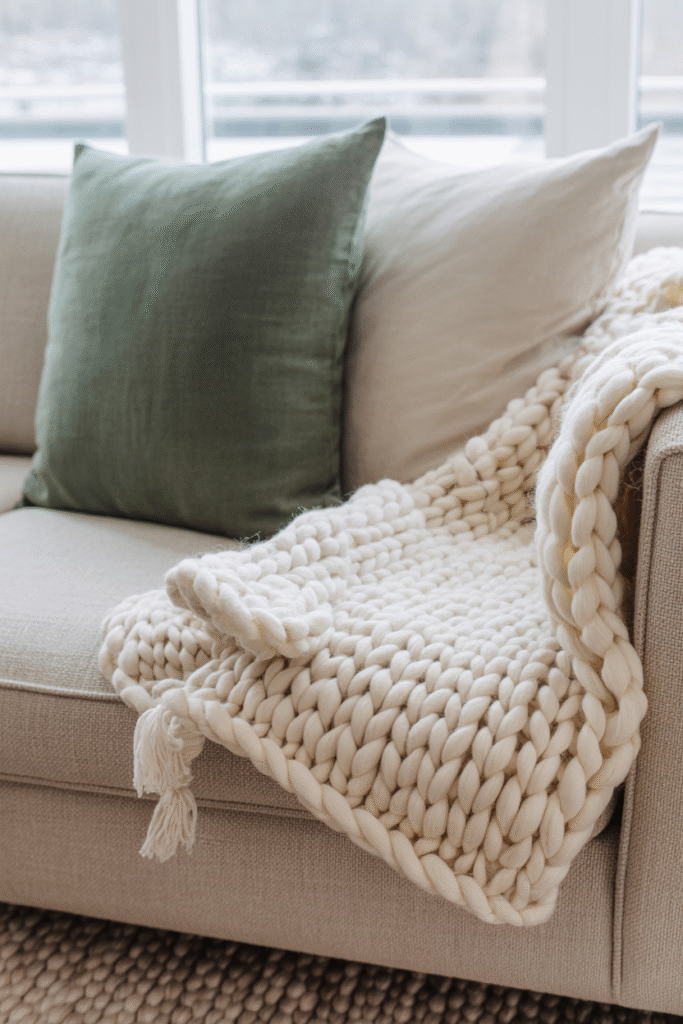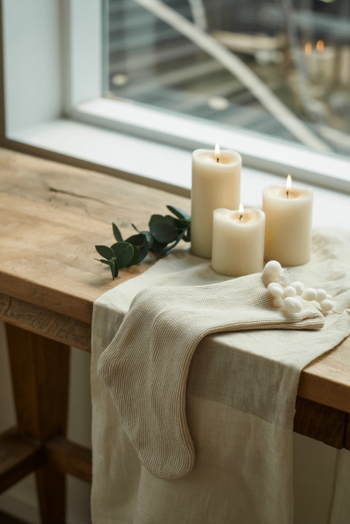 A minimalist holiday doesn’t mean your home should feel cold. Swap in cozy textiles—a chunky knit throw, linen pillow covers in a deep green or cream, or a wool rug under the coffee table. These touches add warmth without visual clutter. I love switching out my everyday throw pillows for linen covers in dusty red and cream—it’s an easy, affordable change that makes the whole room feel special.
